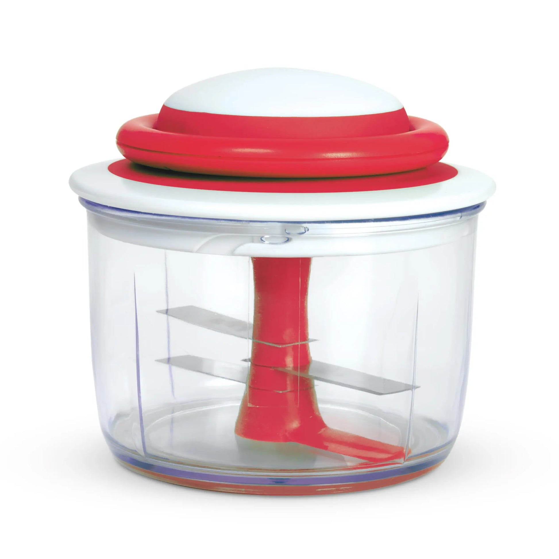 Simply press or pull to activate the sharp blades and watch onions, peppers, garlic, herbs, nuts, and more transform into perfectly chopped pieces. Its compact design makes it ideal for everyday cooking, camping, or quick meal prep, while the vibrant cherry-red finish adds a stylish touch to your countertop.