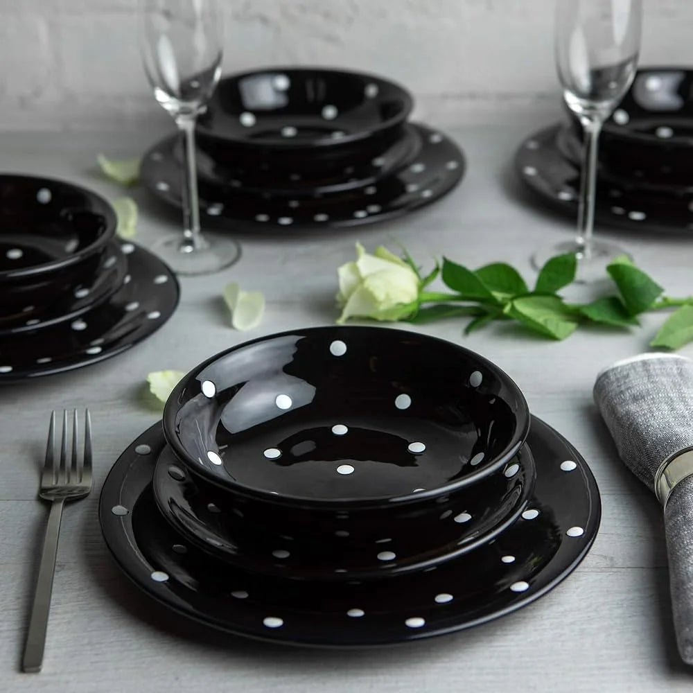 Handmade 12-Piece Black & White Polka Dot Dinnerware Set – Service for 4