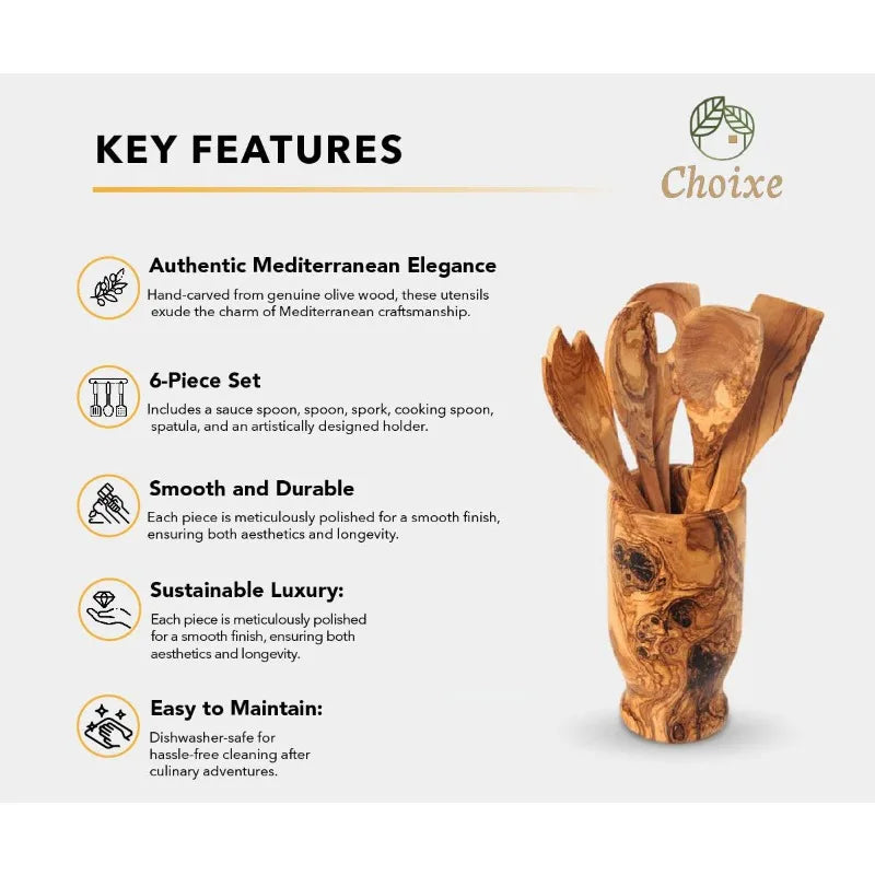 Olive Wood Kitchen Utensils Set with Holder – 6-Piece Natural Wooden Cooking Tools